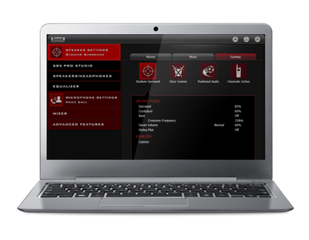 - O SBX Pro Studio Surround proporciona uma experiência de som surround de 360 graus